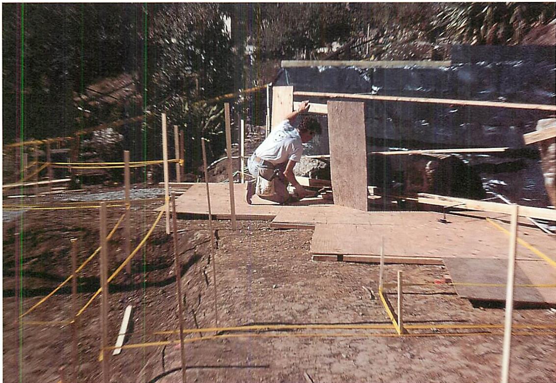 However, once we had the house up, the concrete formed, the upper plaster in place, and the windows primed, the gray and white was so beautiful that painting the upper wall yellow seemed altogether wrong. Separately, Chris and Stephanie, different craftsmen on the project,